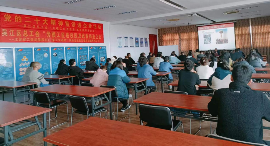 根據(jù)省委、省政府辦公廳《關(guān)于加強(qiáng)和改進(jìn)新時(shí)代江蘇產(chǎn)業(yè)工人隊(duì)伍思想政治工作的實(shí)施意見》文件精神,在全區(qū)開展“勞模工匠進(jìn)校園,思政教師進(jìn)企業(yè)”活動要求,日前公司組織開展以《工匠精神、創(chuàng)新精神和敬業(yè)精神》為主題的培訓(xùn)活動,特邀蘇州信息職業(yè)技術(shù)學(xué)院馬克思主義學(xué)院的孟慶彬老師為我們授課,公司全體黨員、2022年技能競賽獲獎(jiǎng)產(chǎn)業(yè)工人、2023年盛澤鎮(zhèn)最美勞動者近60人參與培訓(xùn)。